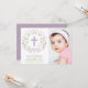 Ce joli et élégant baptême, invitation à baptiser, présente une couronne florale illustrée avec le mot "baptême" encerclant une croix. Le côté droit de la carte comprend une zone photo personnalisable. La couleur du texte, la police et le message peuvent être changés à votre goût. L'arrière de l'invitation est muni d'un arrière - plan violet (qui peut être échangé à n'importe quelle couleur de votre choix) avec un motif en quatrefoil blanc.