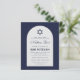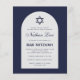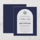 Une invitation de bar mitzvah économique. Sur fond bleu marine, elle comporte une arche blanche avec du texte bleu marine à l'intérieur. Le nom est écrit dans une belle écriture calligraphique. Au-dessus du texte, il y a une étoile de David bleu marine.