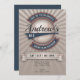 L'invitation de baseball présente une illustration de baseball de style vintage, personnalisée avec le nom, souligné d'un flourish. Cette conception comprend des éléments de bleu, de rouge, un baseball, des bannières et un fond en étoile. Modèle pour personnalisation personnelle, y compris l'âge ou le numéro de joueur.