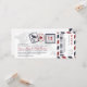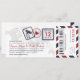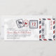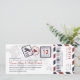 Une carte d'embarquement a inspiré l'invitation de billet avec des détails amusants du tampon de passeport et des bandes d'avion. Montré dans les tons marine, rouge, gris foncé et gris clair. Le côté arrière comprend un espace supplémentaire pour tout hôtel, voyage ou informations sur le site Web.