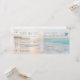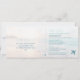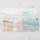 Coucher de soleil océanique rose et pêche sur un fond de surf bleu turquoise aqua sur un arrière-plan de plage de sable lisse sur un thème de billet de carte d'embarquement pour une invitation de mariage sur la plage qui comprend une carte de réponse que les invités peuvent découper et renvoyer. Il y a de la place au dos pour les informations de voyage et d'hôtel.