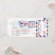 Une carte d'embarquement a inspiré l'invitation de billet avec des détails de timbre de passeport d'amusement et des rayures de par avion. Montré dans les nuances du bleu lumineux, gris-foncé rouge et royal et gris-clair. L'arrière inclut l'espace supplémentaire pour n'importe quelle information d'hôtel, de voyage ou de site Web.
