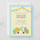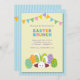 Une invitation au brunch de Pâques, dans de belles couleurs en pastel, comportant un lapin sortant du sien terrier avec des oeufs de pâques et des drapeaux colorés sur un fond rayé bleu.