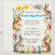 Invitez les gens à votre chasse aux œufs de Pâques avec cette charmante invitation mettant en vedette de mignons lapins, des œufs décorés et de jolies fleurs printanières.