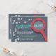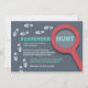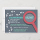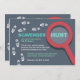 Une invitation à la partie de chasse au cool et au hanche avec des empreintes autour de l'invitation et une loupe au-dessus de la chasse au mot. Les couleurs sont bleu clair, rouge et blanc.