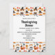 Invitation de dîner de Thanksgiving avec un motif saisonnier de Thanksgiving. Avec des pèlerins fantaisistes, des dindes, de la tarte au potiron et d'autres éléments sur le thème de l'automne.