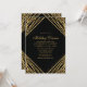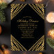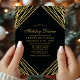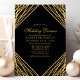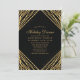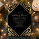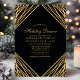 Invitation de dîner de vacances aux lignes abstraites géométriques or noir. Ce design abstrait moderne et élégant présente des lignes de paillettes dorées scintillantes avec des confettis sur un fond noir uni.