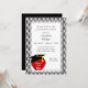 Célébrez la graduation de l'enseignant avec cette invitation en noir et blanc avec une pomme rouge portant une casquette de graduation. Ajoutez les détails de votre fête pour une invitation de type aimable pour le fier diplômé.