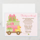 Cette invitation mignonne de baby shower comporte des cadeaux roses et verts de bébé et un caoutchouc mignon dans un chariot. Cette invitation moderne et d'amusement de baby shower est parfaite pour que n'importe quelle maman soit.