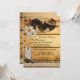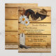 Une invitation romantique de fête après mariage avec deux chevaux sur un panneau de bois avec des fers à cheval, de la dentelle et une botte de cowboy. Idéal pour une réception seule ou une célébration après le mariage avec un thème western ou pour les amoureux des chevaux.