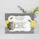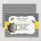 Cette conception a le pois et les copies noirs et blancs de chevron. Il y a deux abeilles de bulle volant autour de l'invitation avec un endroit de mettre la photo de votre enfant.