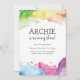 Jetez une partie malpropre d'art d'amusement avec cette invitation lumineuse et colorée de fête d'anniversaire d'art d'éclaboussure d'arc-en-ciel. Tous les détails sont personnalisables.