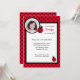 Invitation mignonne de photo d'anniversaire avec un arrière - plan noir et rouge de point de polka, et deux ou trois petites coccinelles. Présentez la photo de votre enfant dans l'espace fourni.