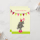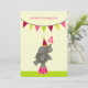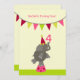 invitation de fête d'anniversaire d'une fille illustrant un éléphant sur le devant. Elephant porte un casquette rouge foncé avec des étoiles et se tient sur une plate-forme rose équilibrant le nombre d'âge de l'enfant sur son tronc. Drapeaux multicolores au sommet. Personnalisez le texte à l'avant et à l'arrière.