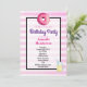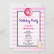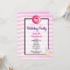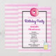 Une invitation de fête d'anniversaire fantaisiste et douce. Un fond rayé rose et blanc. Superposé par-dessus est un overlay semi-transparent avec une bordure noire. Un donut glacé rose avec des paillettes en haut et un verre de limonade rafraîchissante en bas. Personnalisez avec les détails de votre fête.