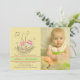 L'invitation de fête d'anniversaire pour le temps de Pâques PARFAIT, de couleur jaune clair, montrant des œufs décorés dans un nid de fleurs de la Reine Anne.