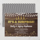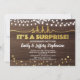 Élégante invitation de fête surprise en or avec une guirlande lumineuse sur fond de bois rustique. Très classe.