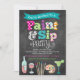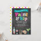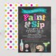 Notre invitation de fête de peinture et de boissons dans le style tableau noir, lumineuse et colorée, est l'invitation parfaite pour tout événement de peinture et de vin. Notre conception présente un fond de tableau noir, un mélange de lettres de motifs amusants tels que des pois, des rayures et des chevrons, ainsi que des illustrations et des graphiques artistiques tels qu'une palette d'artiste, une bouteille de vin, un verre à vin et une margarita !