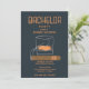 Invitation de fête de bachelor dans un design orange et bleu marine avec cigare et verre de whisky. Personnalisez avec les détails de votre fête.