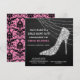 Cette invitation élégante de fête de Bachelorette présente un talon aiguille en strass ou faux diamant argenté sur un fond noir dramatique. Derrière la chaussure se trouve une guirlande lumineuse scintillante. Votre texte personnalisé est en blanc et rose à gauche et en bas. Le dos de l'invitation présente un motif damassé noir vintage sur fond rose assorti. Un mélange de charme vintage et de flair moderne !