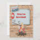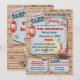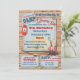 Invitation de fête de Glamping amusante et fabuleuse avec tente, lanterne, feu de camp et guimauve rôtie sur du vieux papier vintage sur fond de planche de bois rustique. Idéal pour une soirée entre filles, une nuit pyjama, une fête d'anniversaire ou une soirée de bachelorette. Illustration dessinée à la main par McBooboo.