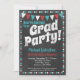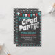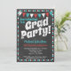 Une invitation funky de fête de fin d'études sur tableau craie aqua et rouge avec le texte en gras "Grad Party !" en haut avec fond de tableau craie, des drapeaux et une bordure à pois mignonne.