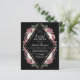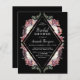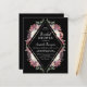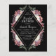 Cartes d'invitation de fiançailles à thème floral et petit budget - comportant un texte manuscrit blanc et un texte en écriture élégante avec un cadre floral, composé de rose poussiéreux, de violet pâle et de blanc et de fleurs vives avec des feuilles de verdure sur fond noir. Le verso de l'invitation de fiançailles est sobre et noir. Profitez-en.