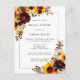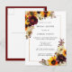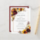Les tournesols dorés, les roses rouge foncé et les fleurs d'hortensia blanc ivoire sont nichés dans les feuilles d'automne et les baies. Ils ornent un cadre doré qui entoure les détails de votre fête de mariage. Le dos de la carte d'invitation à la fête de mariage est bordé de rouge bordeaux profond. Cet article est coordonné avec la collection Tournesol et Bourgogne. Il contient les modèles dont vous avez besoin pour créer une suite d'invitation de fiançailles et des fournitures de fête également.