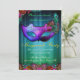 Invitation de fête de masquerade célébration paon. Une invitation élégante et chic présentant un masque de masquerade ton violet avec des fioritures noires et des faux rhinestones autour des yeux, un fond ombré bleu et vert avec un motif damassé subtil qui se fond dans le noir et un texte élégant qui est personnalisable pour les détails de votre fête. Des plumes de paon ornent le masque et les bords inférieurs de l'invitation.