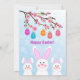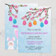 © Socialite Designs. Célébrez Pâques avec les œufs de Pâques colorés, la floraison de cerisier et l'invitation de fond bokeh. Le verso de l'invitation comporte trois lapins mignons. Invitation parfaite pour un brunch de Pâques et une chasse aux œufs ou un dîner de Pâques.