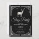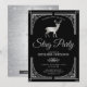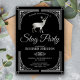 Étonnez vos invités avec cette invitation de fête d'enterrement de vie de garçon élégante avec une bordure argentée ornée et un beau cerf avec une typographie stylisée sur fond noir. Ajoutez simplement vos détails d'événement sur ce modèle facile à utiliser pour en faire une invitation unique. Retournez la carte pour révéler un beau motif d'étoiles argentées au dos de la carte.