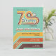Invitation à une fête des années 70 avec une typographie de style rétro 'Fête des années 70'. Les conceptions incluent des éléments inspirés des années soixante-dix de couleur bleue, orange, jaune moutarde, rouge foncé et marron, des rayures et une texture vintage. Comprend un modèle pour une personnalisation personnelle.