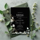 Faites une déclaration audacieuse et sophistiquée avec notre invitation de fiançailles, mettant en vedette un fond noir frappant orné de feuilles d'eucalyptus vert luxuriant. L'élégante écriture ajoute une touche de raffinement, équilibrant parfaitement la modernité chic et l'élégance naturelle. Imprimée sur un papier cartonné luxueux, cette invitation est parfaite pour une célébration stylée, donnant le ton pour une réunion inoubliable en l'honneur de la future mariée.