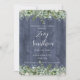 Célébrez la future mariée avec cette invitation de fiançailles élégante avec feuillage d'eucalyptus et fleurs blanches sur fond en bois bleu marine. Complément parfait de notre collection de mariage Navy Wood Eucalyptus.