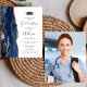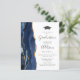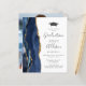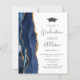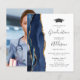 Cette invitation de fête de fin d'études tendance 2026 présente une image aquarelle d'une géode d'agate bleu marine avec des reflets de paillettes dorées fausses. Le mot "Diplômé" et le prénom du diplômé apparaissent dans une écriture manuscrite élégante gris charbon sur fond blanc, ainsi qu'un chapeau de diplômé et les détails de la fête dans des polices sans serif et italique. Remplacez facilement l'image exemple au dos par une photo verticale du diplômé.