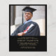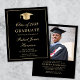 Invitation élégante et abordable pour une fête de remise de diplôme universitaire noire et or, avec une casquette de diplômé, le nom du diplômé et son année de promotion dans un style calligraphié, ainsi que leur école, spécialité et distinctions dans une typographie serif classique. Au verso, ajoutez une photo et personnalisez les détails de votre fête. Ce papier semi-brillant économique est similaire en poids au papier photo -- une version plus épaisse en carton traditionnel est également disponible (envoyez-nous un message pour le lien).
