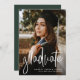Célébrez votre baccalauréat ou diplômé de l'université avec ce faire-part vertical d'une photo qui comprend également de la place sur le dos pour le texte d'invitation de la fête de remise des diplômes. Le script moderne "gradué" sur l'avant en blanc est parfait pour une grille tendance. Le dossier est une couleur classique rouge de l'école avec un motif subtil, mais la couleur peut être changée en n'importe quelle couleur de l'école en cliquant sur "personnaliser".