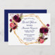 Sur le devant : Un arrière - plan blanc avec un cadre géométrique en faux or. Décorée de fleurs bordeaux foncé et roses, de plumes roses et boho. Modèles pour le nom de la mariée et les détails du parti. Le nom est écrit avec un script de style écrit à la main, des lettres de couleur boucane. Retour : arrière - plan bleu marine.