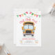 L'invitation présente une illustration de bus jaune avec des confettis colorés et des drapeaux de fête.