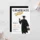 Invitation à la remise des diplômes pour la fête de remise des diplômes du mec. Portrait masculin dessin diplômé en casquette noir et robe, cheveux foncés et ballons d'or 2023. Personnalisez tous les détails de la fête de votre diplômé pour une invitation unique de remise de diplômes.