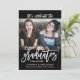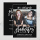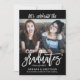 Invitation/faire-part branchée de remise de diplômes pour BFF, frères et soeurs, cousins, membres de la famille, diplômés de quartier ou autres occasions multi-niveaux, cette invitation a le nom des diplômés, année de classe, et l'école sur le devant de l'invitation avec un échantillon de photo que vous remplacez par votre photo désirée. Le verso de l'invitation a un modèle texte pour les détails de la fête de remise des diplômes. Le jeu de couleurs est noir avec du texte blanc.