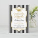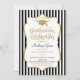 Une élégante invitation à la fête de graduation en noir et or avec cadre d'accent de parties scintillant en faux or et rayures noir et blanc avec du texte en or et noir et une casquette de graduation en or. Cet invitation de la catégorie de diplôme est parfait pour les écoles secondaires, les universités, les collèges ou tout type de célébration de l'école supérieure.