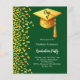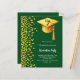 Une invitation moderne et élégante à Graduation Party. Un arrière - plan vert émeraude décoré de faux confettis d'or et d'une grande casquette de graduation dorée avec goût. Personnalisez et ajoutez un nom et des détails du parti. Texte blanc. 1 feuille = 1 invite imprimé bord à bord.