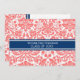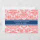 Invitation de la fête de graduation carte personnalisée dans élégant et sophistiqué peach rose orange, bleu marine foncé et blanc classique vintage damas floral modèle classique. Customisez cette carte de faire-part en ajoutant l'année de votre diplôme et les détails de votre fête de graduation.