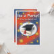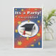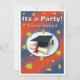 Invitation à une soirée de remise de diplômes, avec photo de casquette et de diplôme sur arrière - plan texturé, de bleu et rouge/orange avec étoiles jaunes.