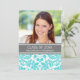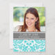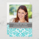 Invitation de la fête de graduation carte modèle photo personnalisée dans le bleu d'aqua turquoise élégant et sophistiqué, gris fusain sombre et blanc classique vintage damas floral classique. Customisez cette carte de faire-part en ajoutant l'année de votre diplôme, votre photo et les détails de votre fête de graduation.