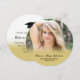 Cette invitation ronde de remise de diplômes comporte un cadre photo personnalisable qui remplit l'intégralité de l'avant de l'invitation. Le devant est accentué d'un dégradé d'or près du fond et offre du texte personnalisable pour le nom de la diplômée, le nom du lycée et l'année de graduation. Le dos offre le même dégradé de couleur or avec un mortier en haut et le texte personnalisable pour le texte de l'invitation de la partie graduation.