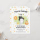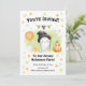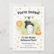 Petit Boo Halloween Invitation avec un mignon fantôme de bébé aquarelle avec un casquette sorcier, citrouilles, coeurs, étoiles et un ballon orange. Modèle modifiable d'invitation Halloween.