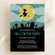 Notre sorcière au-dessus d'un cimetière L'invitation de la fête d'Halloween est parfaite pour la fête d'Halloween de votre enfant ! Cette invitation personnalisable présente une silhouette de sorcière éffrayante volant dans le ciel nocturne au-dessus d'un cimetière éffrayant surélevé avec une pleine lune brillante derrière elle.