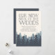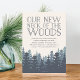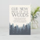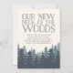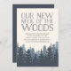 Invitations amis et famille à votre nouveau cou des bois avec nos invitations à la fête de la forêt d'hiver. Des cartes rustiques chic en bleu-gris et blanc bleu marine fumé présentent une forêt luxuriante de pins sur un arrière - plan en ivoire, avec "notre nouveau cou des bois" en lettrage bleu marine fumé. Personnalisez avec les détails de votre fête en utilisant les champs fournis.